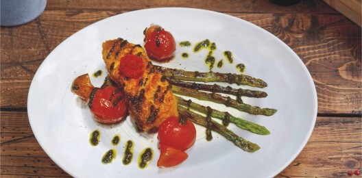 Стейк из семги, обжареный с зеленой спаржей