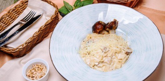Паста фетучини с лососем: лосось, шпинат,сливки, сыр пармезан